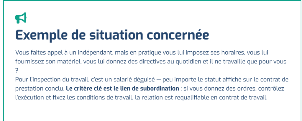 Si votre relation avec un prestataire indépendant remplit ces critères (notamment horaires imposés, directives précises sur la manière d’effectuer le travail, intégration à une équipe de salariés, usage exclusif de votre matériel, absence d’autre clientèle), vous êtes en situation de risque élevé.